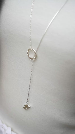 由人手敲打模仿月亮的紋理製作成的月亮和兩顆疊在一起的星星組成的長頸鏈。